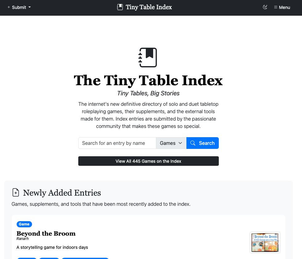 After a little over a year of maintaining the Tiny Table Index as a community-driven directory of solo and duet tabletop roleplaying games, I’ve decided to transition this resource into an archive. The complete dataset is now available as a downloadable CSV file for anyone to use, analyze, or build upon.