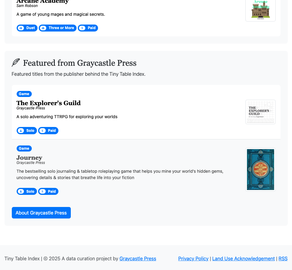 Join the Graycastle Press mailing list below to receive notifications if and when the Tiny Table Index dataset is updated with new games and resources.