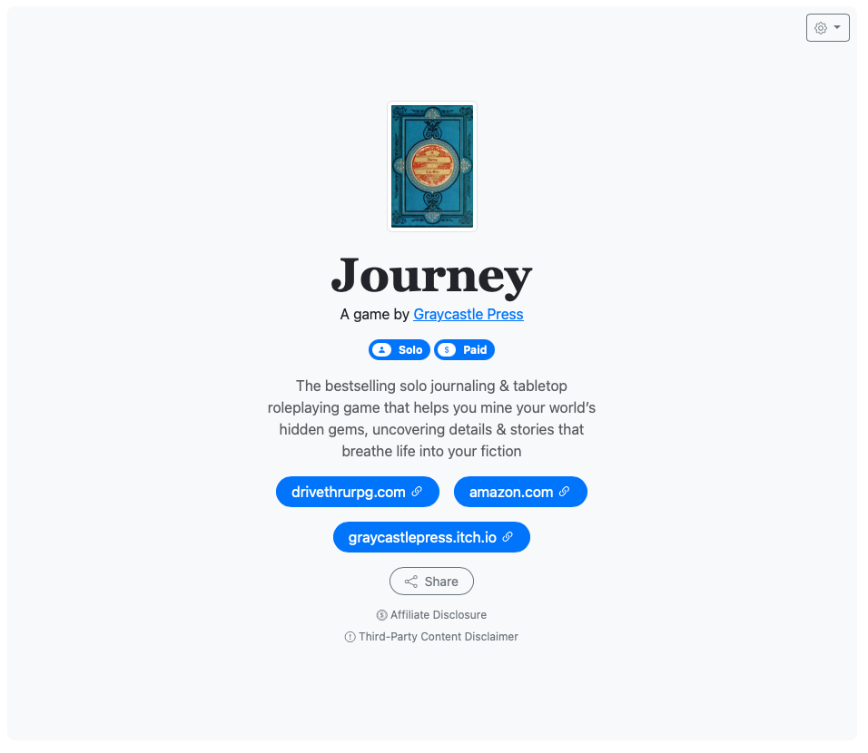 This dataset contains over 450 solo and duet TTRPGs with detailed information including: