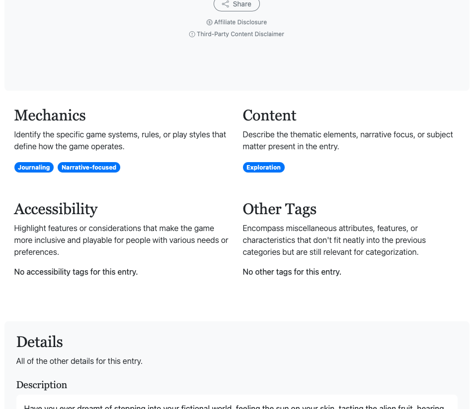Basic information and description for each game (descriptions largely scraped directly from game marketplace pages like DriveThruRPG or Itch.io at the time they were added to the Tiny Table Index)